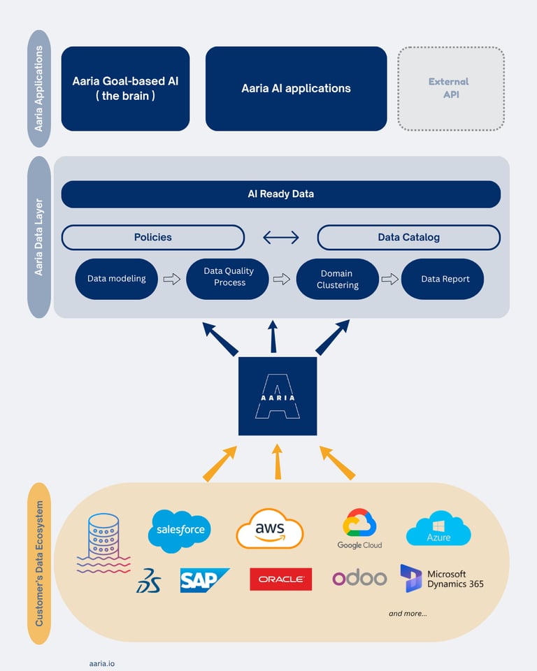 Aaria sits as a read-only intelligence layer between your existing systems and your operations team. Nothing is moved, nothing is replaced